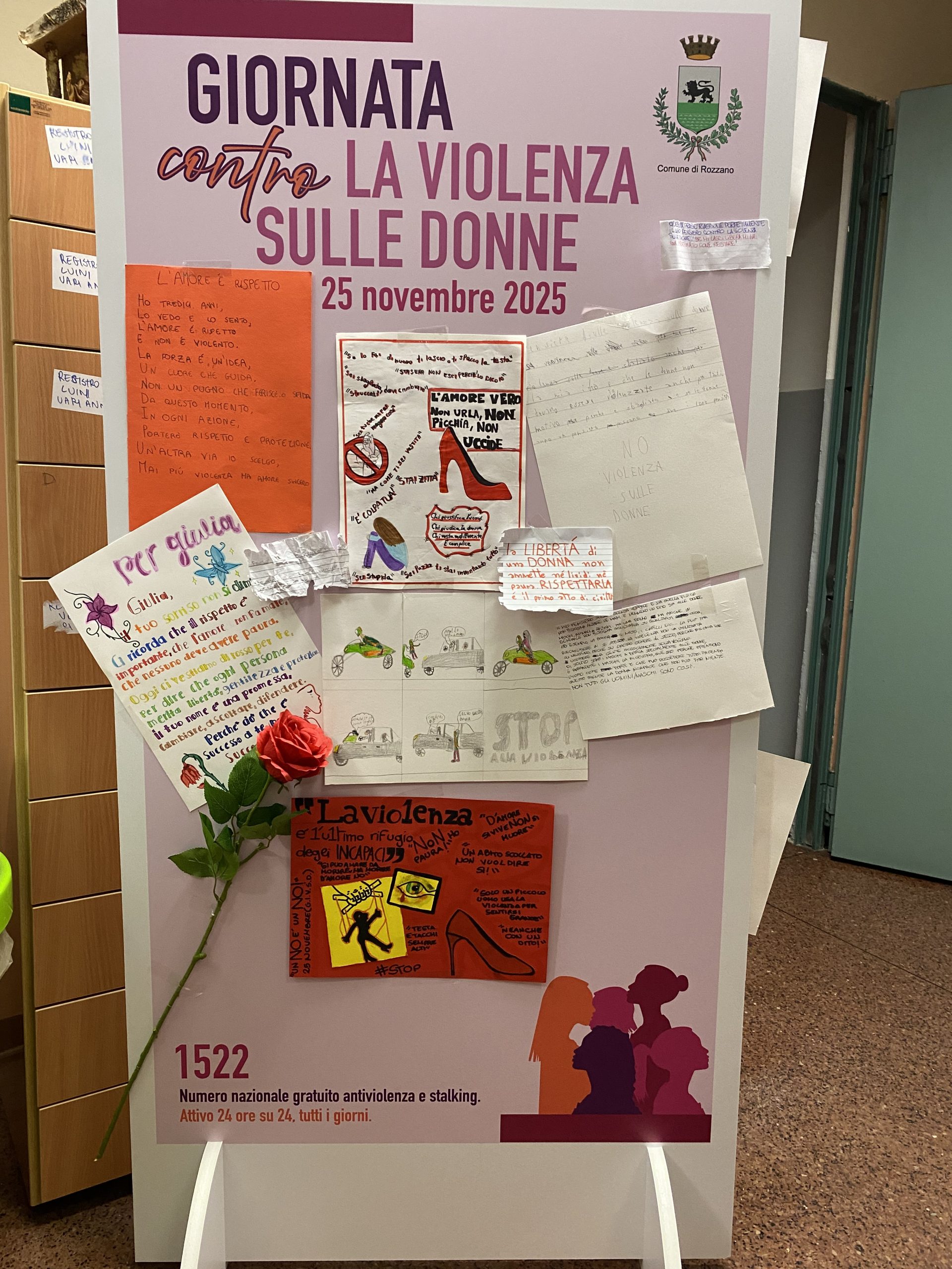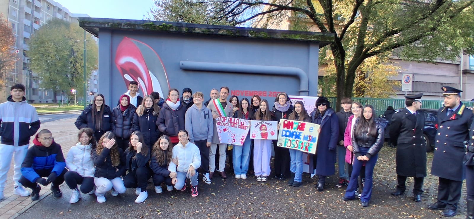 In occasione della giornata contro la violenza sulle donne, alla presenza dell’amministrazione comunale e della nostra dirigente Antonella Romagnolo, è stato inaugurato un murales composto da tre parti (una rosa rossa col gambo spezzato, una scarpetta rossa, una donna che si ripara il volto) davanti alla sede di viale Liguria.