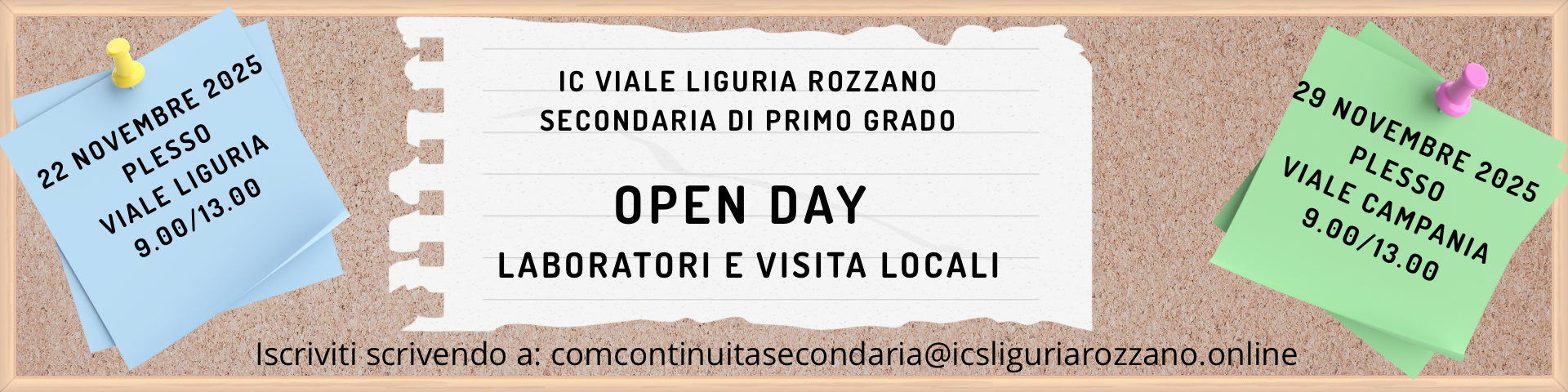 Open Day - Scuola Secondaria di I Grado - Laboratori e visita dei locali. Iscriviti scrivendo a comcontinuitasecondaria@icsliguriarozzano.online